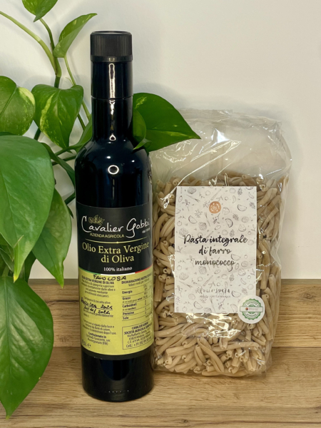 Un abbinamento semplice e perfetto: la pasta di farro monococco, leggera e nutriente, incontra l’olio EVO Cavalier Gobbi, frutto della tradizione e dell’elettrocoltura. Una box che porta in tavola autenticità e benessere.