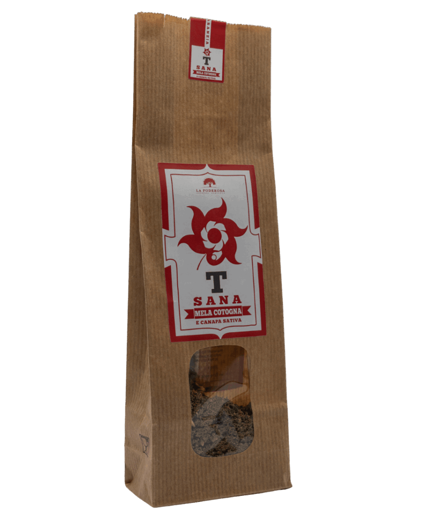 La mela cotogna, frutto antico e naturalmente ricco di pectine, apporta una nota morbida, rotonda e leggermente acidula, bilanciando il gusto deciso della canapa e rendendo la tisana armonica e piacevole.